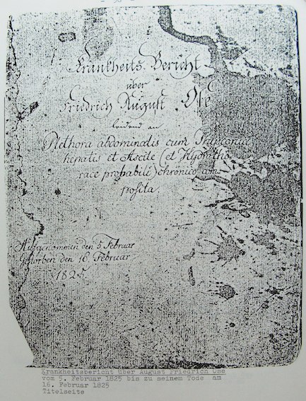 Die Diagnose ließ wenig Hoffnung auf Genesung. Man versuchte mit Medikamenten zu helfen, die in dem Krankheitsbericht genau verzeichnet sind. Die Schwellung des Unterleibs nahm zu, die Atmung wurde schwieriger. So ging es dem Kranken von Tag zu Tag schlechter. Am 14. Februar setze der Puls bei jedem 4. bis 9. Schlag aus. Am 16. Februar früh 3 Uhr trat ein schmerzloser Tod ein, nachdem schon um Mitternacht völlige Sprachlosigkeit erkennbar war. Es ist mit Sicherheit anzunehmen, dass sein Sohn Johann Karl Wilhelm an seinem Krankenbett weilte und auch den Tod seines Vaters miterlebte. Ob auch der jüngste Sohn Friedrich August anwesend war, wissen wir nicht.