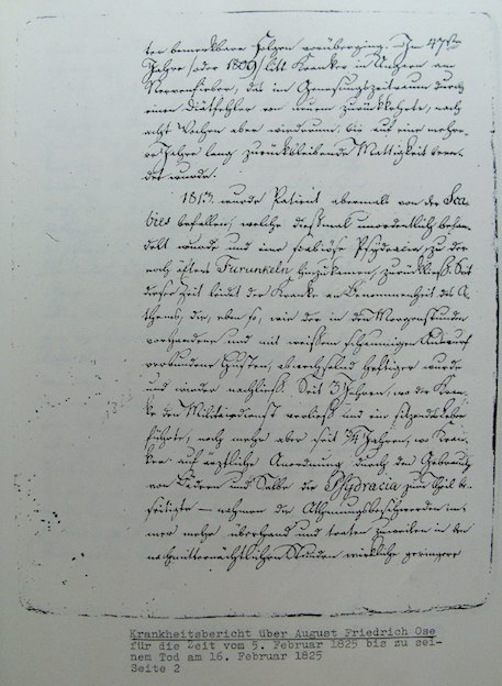 Ungetrübt waren die Jahre als Pensionär ebenso wenig wie auch die letzten Berufsjahre für August Friedrich Ose wohl nicht, weil seine Gesundheit noch durch das in Kriegszeiten sehr ungesunde und anstrengende Soldatendasein gelitten hatte. Wir besitzen einen Krankheitsbericht aus seinen letzten Lebenstagen, der uns über seinen Gesundheitszustand genau informiert. Dieser Krankheitsbericht ist vermutlich die Arbeit eines Medizin-Studenten der Medizinisch-chirurgischen Akademie in Dresden, die damals sein Sohn Johann Karl Wilhelm (1798-1880) besuchte. Dieser Bericht ist für uns auch deshalb von unschätzbarem Wert, weil dort auch frühere Krankheiten angegeben sind mit Jahreszahl und Ort, was uns gestattet, das Leben als Soldat von August Friedrich Ose weitgehend zu rekapitulieren.