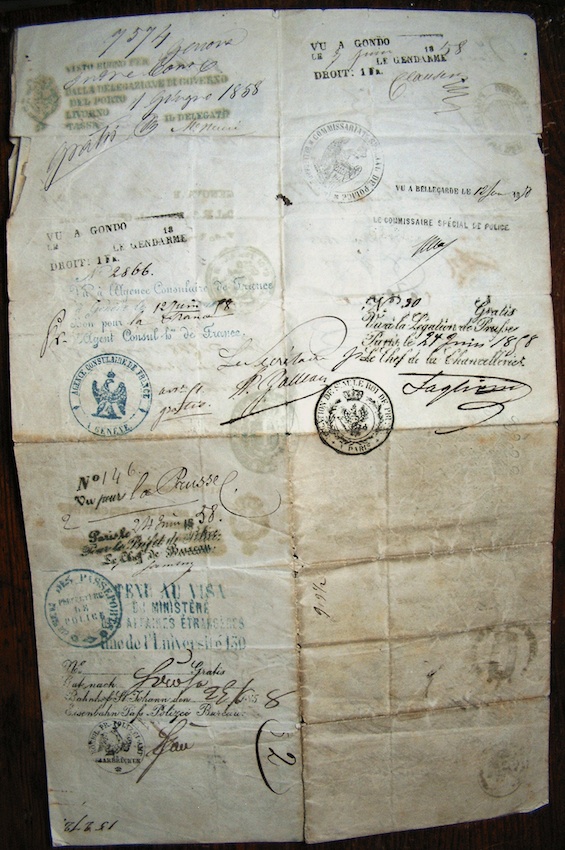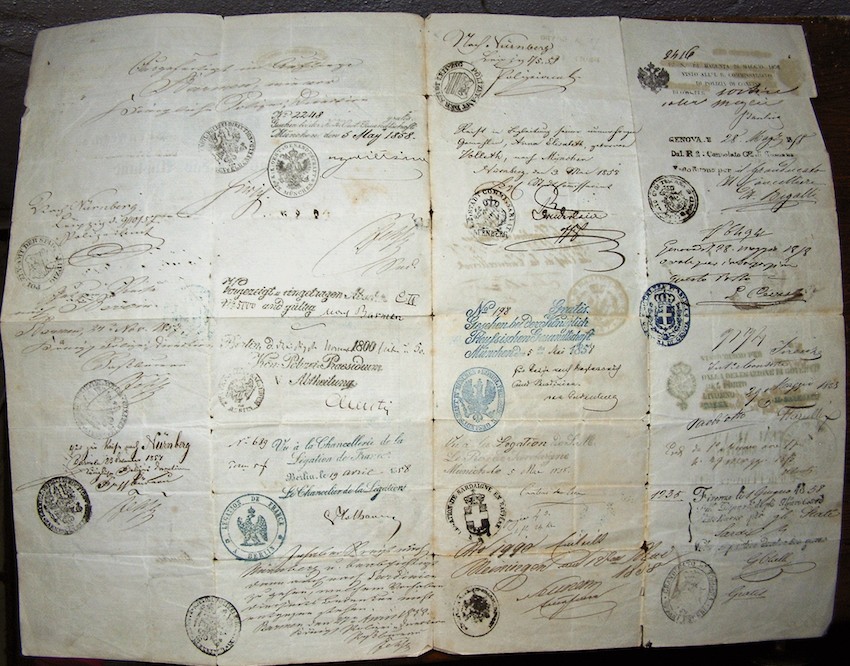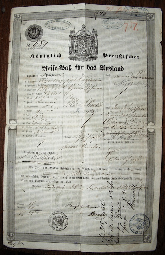 Ein Reisepass der Familie Mesthaler von 1858, der Eltern von Hildegard Bernhardi. Ihr Vater war Kommerzienrat in Nuernberg.